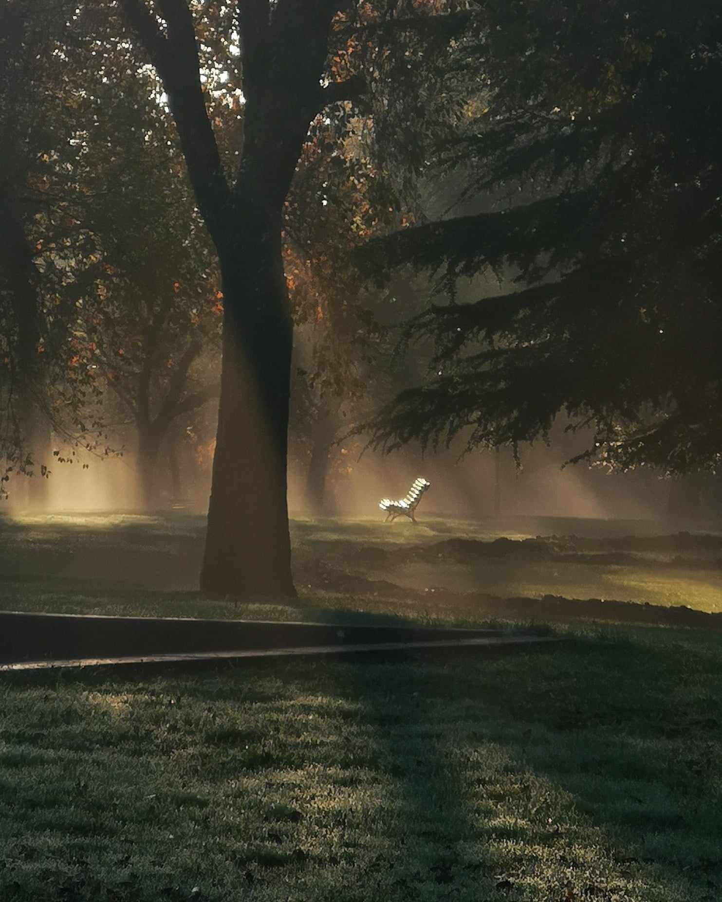 - “La espera”, fotografía tomada en el Parque de la Ciudadela de Pamplona por Gabriella Rozsa retrata a la ciudad que se despierta de la oscuridad de la noche y observamos un banco esperando a alguien envuelto por los rayos de luz que se abren paso entre la niebla de mañana.