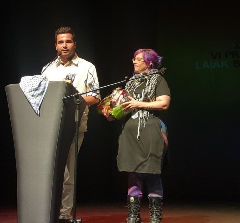 El pasado 20 de septiembre el Centro Cultural Tafalla Kulturgunea celebró la sexta edición de los Premios LAIAK LGTBIQ+. La cita, organizada por la Asociación LAIAK Zona Media, se ha consolidado como un referente en Navarra al reconocer a personas, colectivos e iniciativas que trabajan en favor de una sociedad más plural, justa y libre. Entre los reconocimientos de este año, la organización ha concedido una mención especial para el cortometraje finalista del certamen de cortometrajes Navarra, Tierra de Cine 2024 “Miradas Cruzadas”, dirigido por Gabriel Mansilla y rodado en Tafalla. La cinta, ambientada en la Guerra Civil, narra una historia de amor entre dos jóvenes, poniendo en el centro las realidades silenciadas durante décadas y reivindicando la memoria histórica desde una perspectiva LGTBIQ+. Recogieron el Premio el director del cortometraje, Gabriel Mansilla y su directora de Arte, Raquel Ortega.