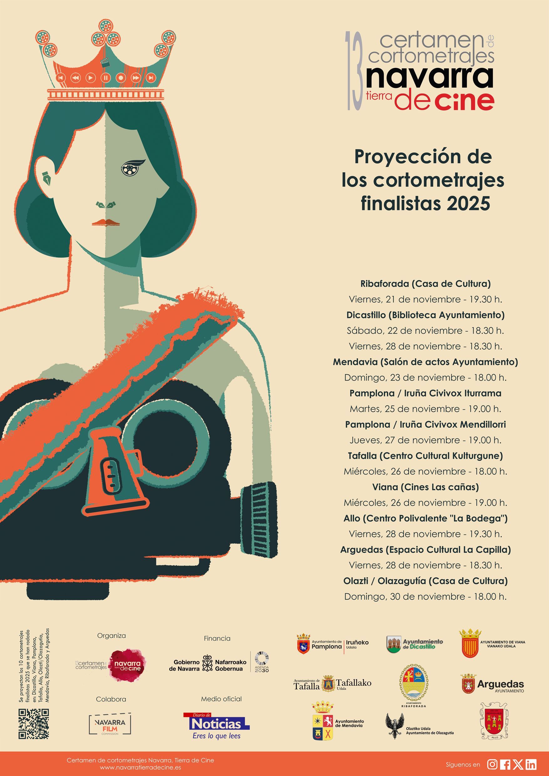 Los diez finalistas de Navarra, Tierra de Cine 2025 ya han rodado y montado sus proyectos entre los meses de septiembre a noviembre. Ahora se puede ver el resultado final en pantalla grande entre el 21 y el 30 de noviembre y con subtítulos para facilitar el visionado a personas con discapacidad auditiva en los nueve municipios participantes de esta edición. La temática de las obras que se van a proyectar este año es muy variada, con historias contadas a través de diferentes géneros desde el fantástico y aventura hasta el drama y la comedia dirigido a todas las edades.